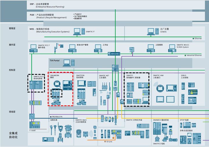 現(xiàn)實中雖然完全可以用PLC搭建自己的CNC系統(tǒng),DIY一個自己的機(jī)加工中心也是可行的,西門子的s7-1500T系列加私服電機(jī)配合TIA軟件集成運動控制和人機(jī)界面,需要全面的一體機(jī)開發(fā)經(jīng)驗,沒有一個整體團(tuán)隊是完成不了的。所以等你開發(fā)完發(fā)現(xiàn)西門子本身就有成體系的數(shù)控機(jī)床系統(tǒng)840D,集成度更好,功能更完善??匆幌挛鏖T子的全集成自動化大圖中,數(shù)控和控制器的位置,紅框是數(shù)控系統(tǒng),黑框是控制器部分,數(shù)控系統(tǒng)中的輔助功能都是PLC來控制的。